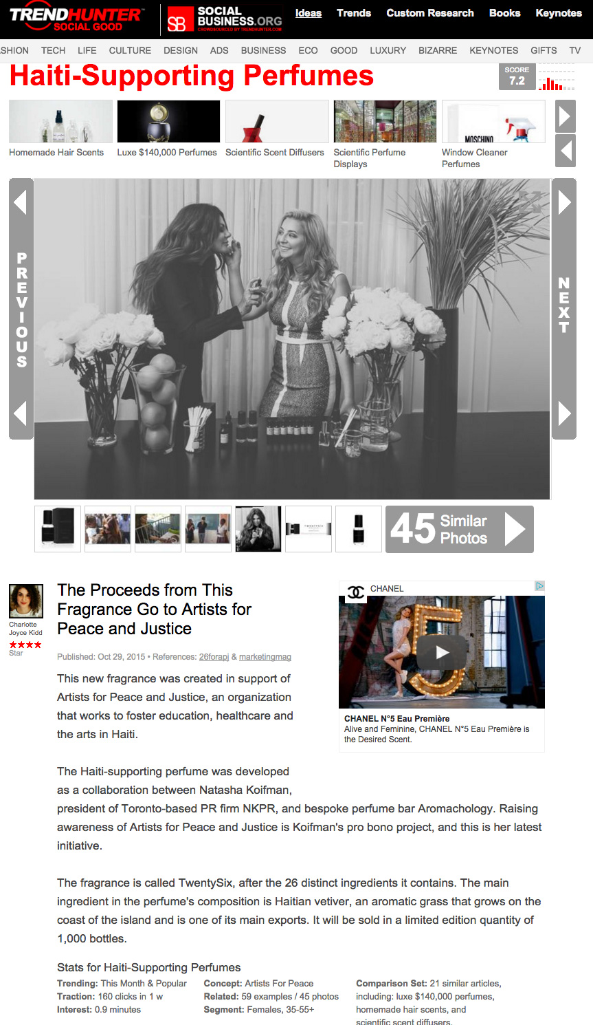 Born out of passion and purpose, Natasha Koifman, President of NKPR and Board Chair for Artists for Peace and Justice (APJ) has partnered with custom scent experts Aromachology to create a philanthropic fragrance, TWENTYSIX, in support of APJ’s mission to support communities in Haiti and remove barriers that poverty creates for Haitian children.